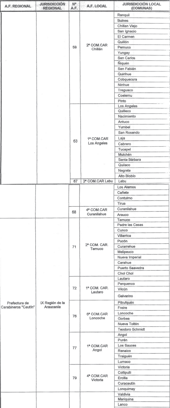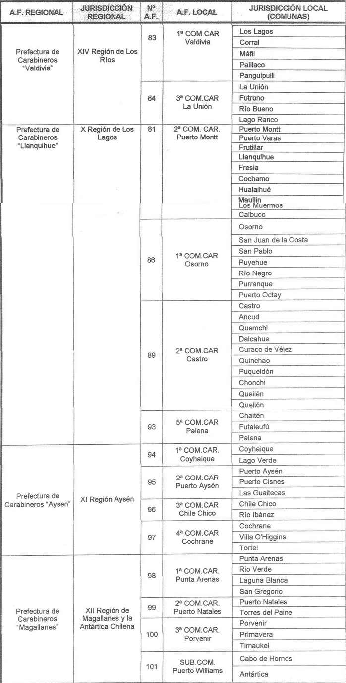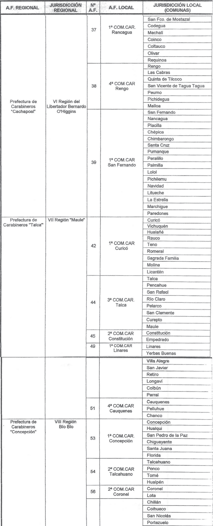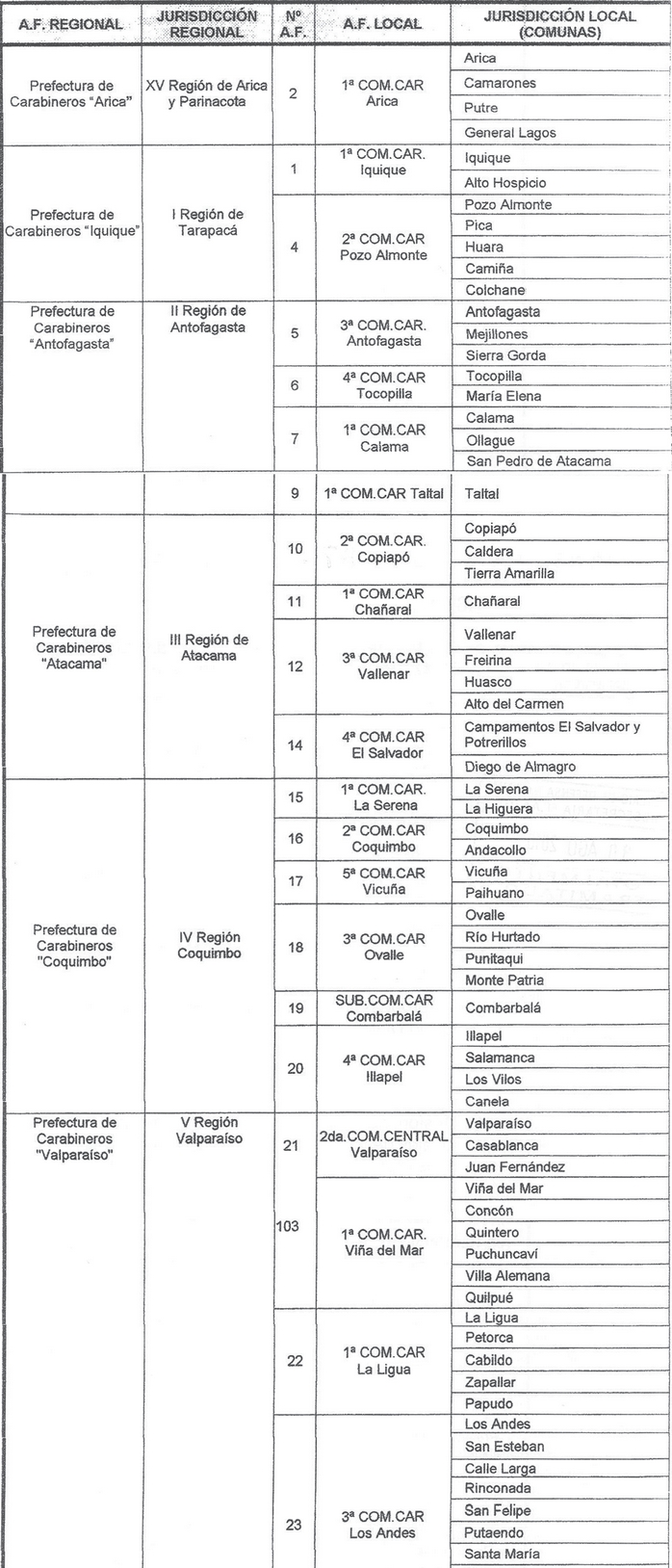 1. Desígnase como autoridades fiscalizadoras, tanto regionales como locales, de la Ley Nº 17.798, para las zonas jurisdiccionales que se indican, a las reparticiones de Carabineros de Chile que se señalan: