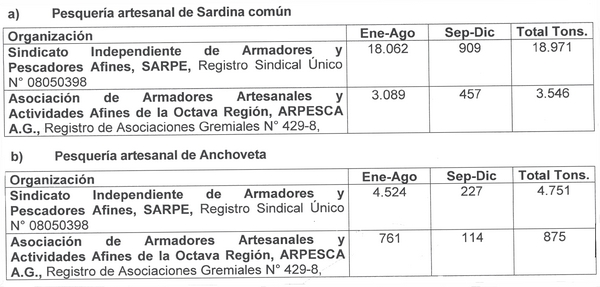 Por resolución Nº 04/2010 exenta, de fecha 25 de agosto 2010, de la Dirección Zonal de Pesca de las Regiones V a IX e Islas Oceánicas, modifíquese el numeral 2º letras a) y b) de la resolución exenta Nº 831 de 2010, de esta Subsecretaría, y sus modificaciones posteriores, que distribuye la fracción artesanal de pesquería de Anchoveta y Sardina común en la VIII Región, sometida al Régimen Artesanal de Extracción por unidad de asignación organizaciones de pescadores artesanales para el período comprendido entre la fecha de entrada en vigencia de la resolución antes indicada y el 31 de diciembre de 2010, en el sentido de modificar las asignaciones para el recurso Anchoveta y Sardina común, correspondientes a las organizaciones artesanales: Sindicato Independiente de Armadores y Pescadores Afines, SARPE, Registro Sindical único Nº 08050398 y la Asociación de Armadores Artesanales y Actividades Afines de la Octava Región, ARPESCA A.G., Registro de Asociaciones Gremiales Nº 429-8, de acuerdo con lo siguiente: