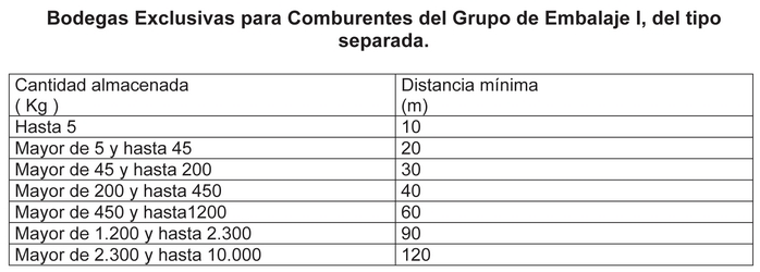 Artículo 15.- Podrán almacenarse sustancias peligrosas en bodegas comunes, cuando la cantidad total sea como máximo 12 t. Dentro de estas 12 t, se podrá almacenar líquidos y sólidos inflamables y comburentes del grupo de embalaje III que no superen las 3 t en su conjunto y 250 kg de cilindros con gases de la división 2.2. No podrán almacenarse en bodegas comunes los peróxidos orgánicos clases A a la D, los comburentes de los grupos de embalaje I y II, gases inflamables correspondientes a las clases 2.1, gases tóxicos división 2.3 y los inflamables de la clase 4.3 "sustancias que en contacto con el agua desprenden gases inflamables", todos los cuales deberán estar en bodegas para sustancias peligrosas.