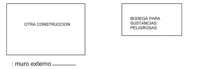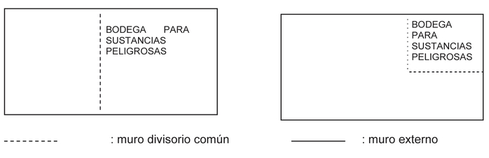 Bodega para sustancias peligrosas adyacente: Instalación que tiene como mínimo un muro divisorio común y como máximo dos muros divisorios comunes con otros sectores o instalaciones de la misma construcción destinadas a otros usos o al almacenamiento de otras clases de sustancias.