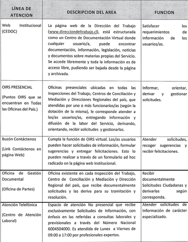 Cuarto.- Estará bajo la dependencia funcional del Departamento de Atención de Usuarios, el área de Atención Presencial y Documental, que se desarrolla a través de las siguientes líneas de atención: OIRS PRESENCIAL (Puntos OIRS que se encuentran en todas las oficinas del país.); Oficina de Gestión Documental (Oficinas de Partes); Atención presencial en oficinas Inspectivas; Atención documental en dependencias operativas.