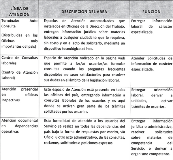 Tercero.- Estará bajo la dependencia jerárquica y funcional del Departamento de Atención de Usuarios, el área de Atención No Presencial o Atención a Distancia, que se desarrolla a través de las siguientes líneas de atención: Web Institucional (CEDOC); Buzón Contáctenos (Link Contáctenos en página Web); Atención Telefónica (Centro de Atención Laboral); Terminales Auto Consulta (Distribuidas en las Oficinas más importantes del país); Centro de Consultas laborales; (Centro de Atención Laboral).