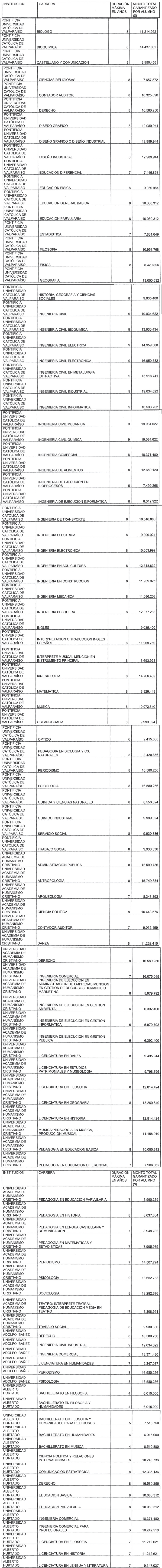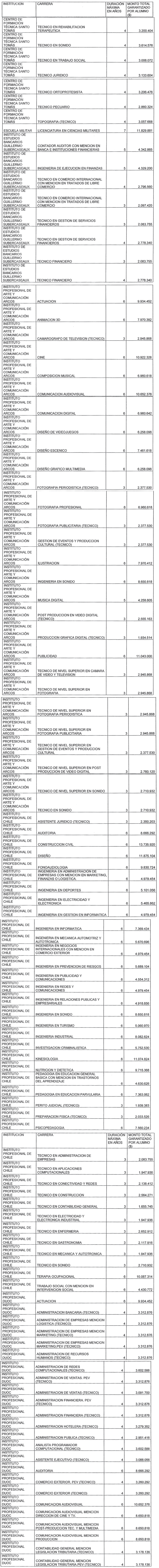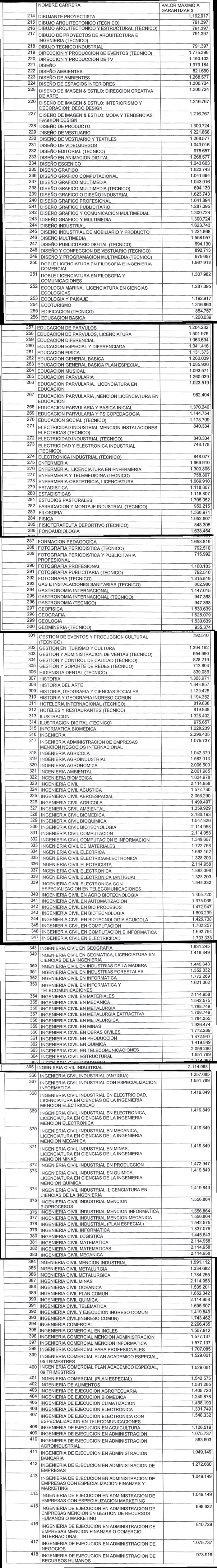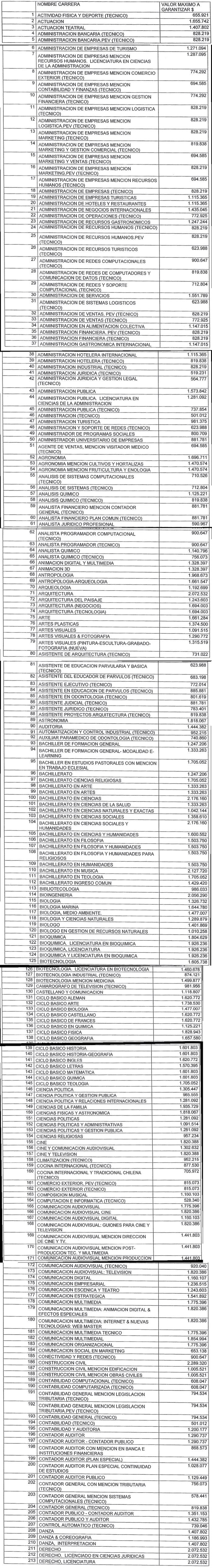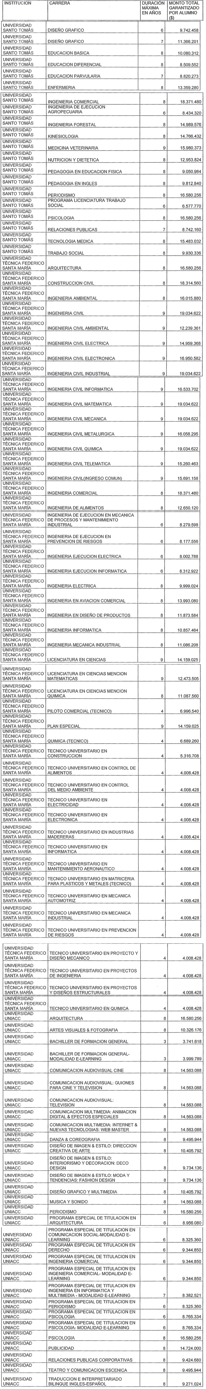 Artículo 4°.- Determínase, para efectos de lo dispuesto en el inciso tercero del artículo 4° de la Ley N° 20.027 y en el artículo 34° del Decreto Supremo N° 182, de 2005, del Ministerio de Educación, que el monto total garantizado por alumno no podrá exceder los valores que para cada institución superior y carrera se indican en la tabla siguiente, valores a los que se les agregará: a) la variación que experimente el Índice de Precio del Consumidor (IPC) elaborado por el Instituto Nacional de Estadísticas; b) la capitalización de los intereses devengados y no pagados de los créditos otorgados por las instituciones financieras, y c) la variación que registre anualmente el valor del arancel de referencia para cada carrera e institución de educación superior. Las variaciones de los valores que se producen por estos tres conceptos serán contadas desde la fecha de otorgamiento de los créditos garantizados y hasta el momento en que se deba ejercer el pago de la garantía del Fisco.