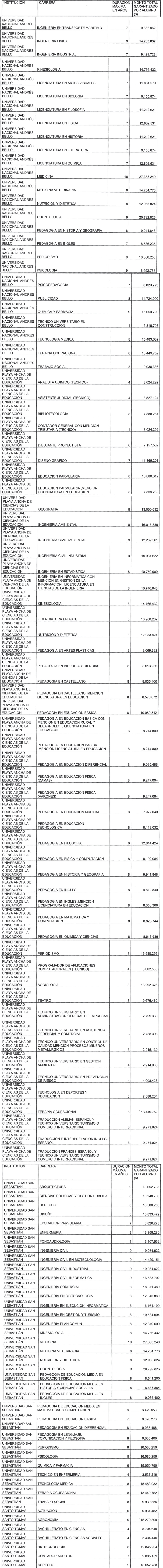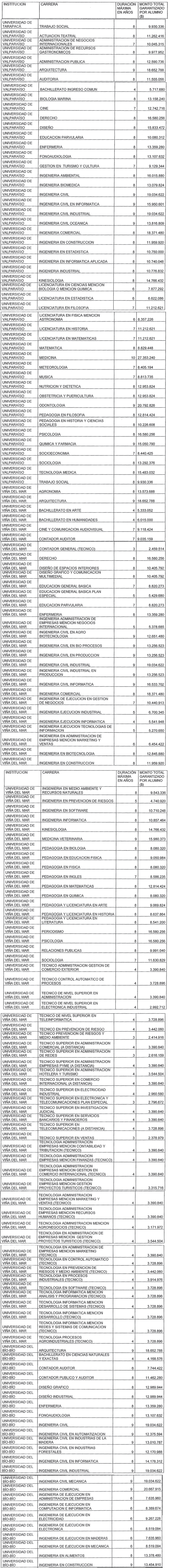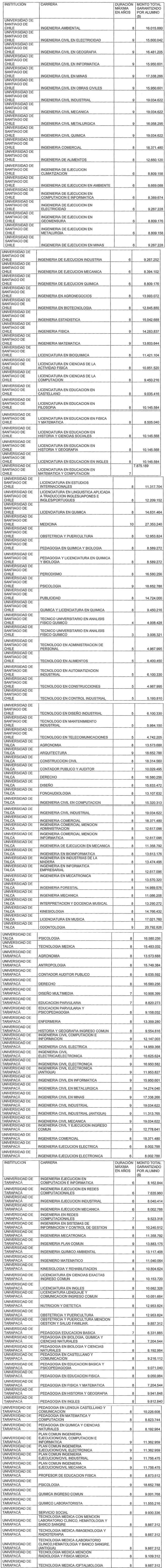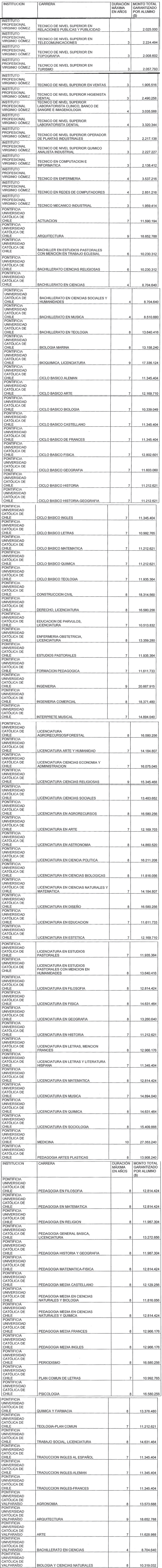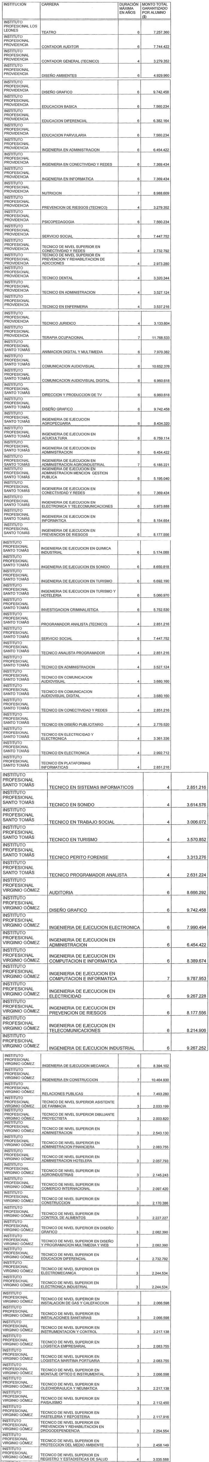 Artículo 4°.- Determínase, para efectos de lo dispuesto en el inciso tercero del artículo 4° de la Ley N° 20.027 y en el artículo 34° del Decreto Supremo N° 182, de 2005, del Ministerio de Educación, que el monto total garantizado por alumno no podrá exceder los valores que para cada institución superior y carrera se indican en la tabla siguiente, valores a los que se les agregará: a) la variación que experimente el Índice de Precio del Consumidor (IPC) elaborado por el Instituto Nacional de Estadísticas; b) la capitalización de los intereses devengados y no pagados de los créditos otorgados por las instituciones financieras, y c) la variación que registre anualmente el valor del arancel de referencia para cada carrera e institución de educación superior. Las variaciones de los valores que se producen por estos tres conceptos serán contadas desde la fecha de otorgamiento de los créditos garantizados y hasta el momento en que se deba ejercer el pago de la garantía del Fisco.