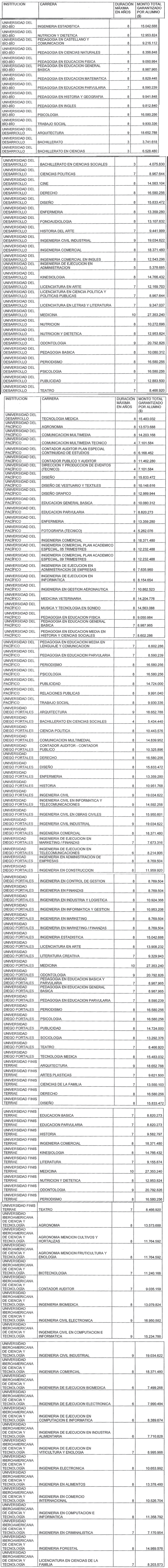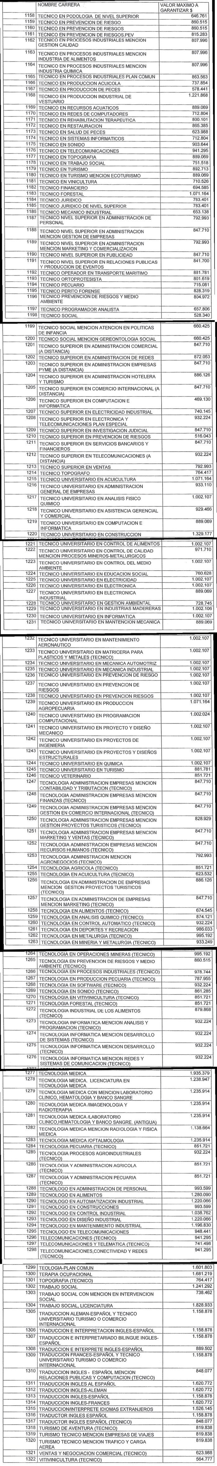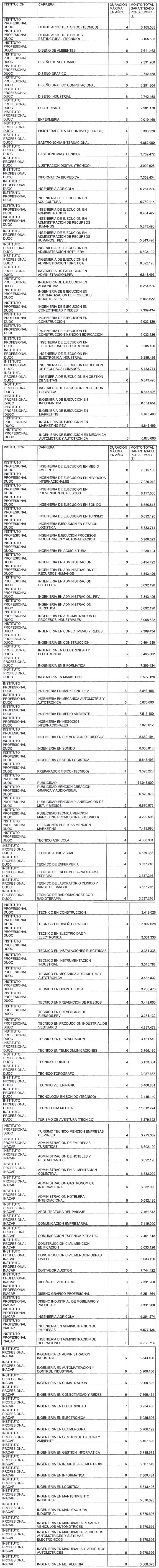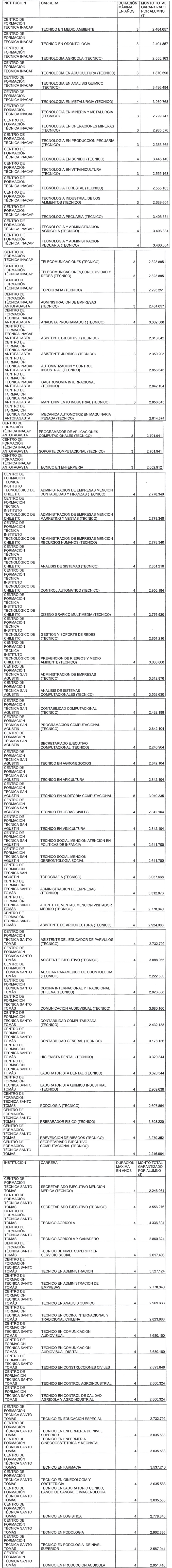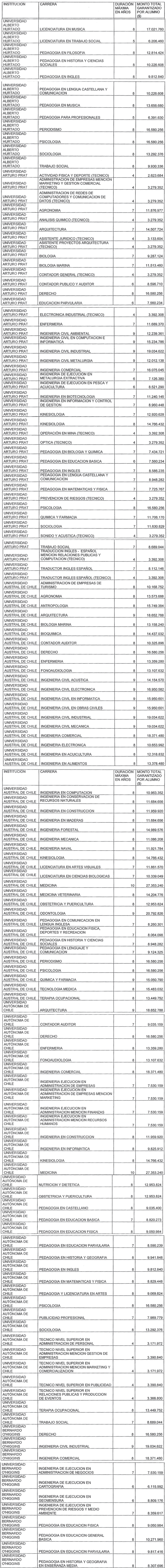 Artículo 4°.- Determínase, para efectos de lo dispuesto en el inciso tercero del artículo 4° de la Ley N° 20.027 y en el artículo 34° del Decreto Supremo N° 182, de 2005, del Ministerio de Educación, que el monto total garantizado por alumno no podrá exceder los valores que para cada institución superior y carrera se indican en la tabla siguiente, valores a los que se les agregará: a) la variación que experimente el Índice de Precio del Consumidor (IPC) elaborado por el Instituto Nacional de Estadísticas; b) la capitalización de los intereses devengados y no pagados de los créditos otorgados por las instituciones financieras, y c) la variación que registre anualmente el valor del arancel de referencia para cada carrera e institución de educación superior. Las variaciones de los valores que se producen por estos tres conceptos serán contadas desde la fecha de otorgamiento de los créditos garantizados y hasta el momento en que se deba ejercer el pago de la garantía del Fisco.