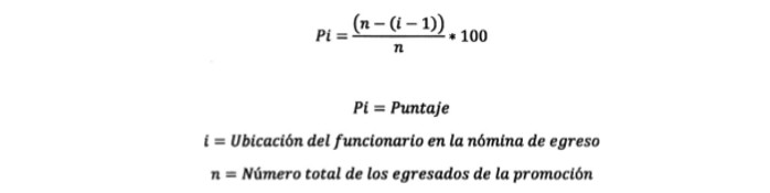 El puntaje asociado al orden de egreso será de 100 para el funcionario que obtenga la primera ubicación en la nómina de egreso de la respectiva promoción. Para los demás funcionarios de la nómina de egreso de dicha promoción se calculará el puntaje en base a la siguiente fórmula: