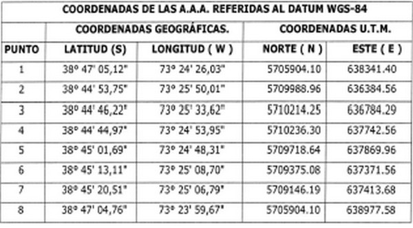 "3º.- Fíjanse como Áreas Apropiadas para el Ejercicio de la Acuicultura (A.A.A.), en la IX Región de la Araucanía, los terrenos de playa fiscales, playas de río, porciones de agua y fondo de río, correspondientes a un sector del río Imperial, ubicado en la comuna de Saavedra, provincia de Cautín, comprendidos hasta las líneas imaginarias que unen las coordenadas geográficas de los vértices que especifican sus límites, señaladas en el Plano IX-02-SSP, escala 1:20.000, 1ª edición 2008, Datum WGS-84, editado por la Subsecretaría de Pesca en base a los Planos del Borde Costero elaborados por el Ministerio de Defensa Nacional, revisados y aprobados por el Servicio Hidrográfico y Oceanográfico de la Armada de Chile.