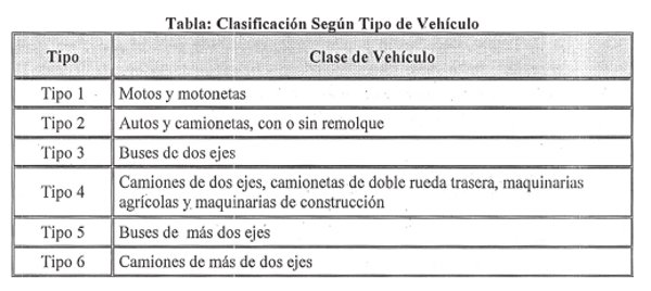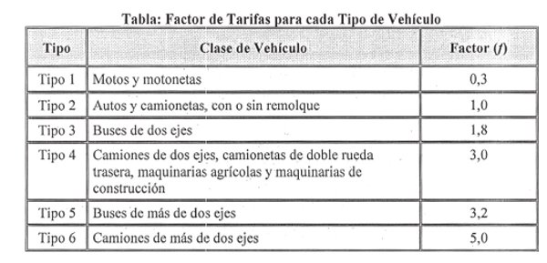 Factor de Tarifas para cada Tipo de Vehículo
