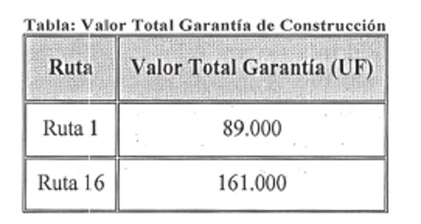 Dentro del plazo de noventa (90) días contados desde el inicio del plazo de la Concesión y de la Etapa de Construcción, señalado en el artículo 1.7.5 de las Bases de Licitación, el Adjudicatario o la Sociedad Concesionaria en su caso, deberá entregar la Garantía de Construcción para cada ruta, la cual deberá estar constituida por diez (10) boletas de garantía bancaria, de igual monto, o bien, por una póliza de seguro de garantía de ejecución inmediata para concesiones de obras públicas según lo dispuesto en el artículo 1.8.1.3 de las Bases de Licitación, pagaderas a la vista, emitidas en Santiago de Chile por un Banco o Compañía de Seguros de la plaza, según corresponda, a nombre del Director General de Obras Públicas y cuya glosa y/o materia asegurada deberá ser la siguiente: "Para garantizar el cumplimiento de las obligaciones durante la Etapa de Construcción de la Obra Pública Fiscal denominada Alternativas de Acceso a Iquique". El valor total de la Garantía de Construcción para cada ruta del Proyecto se indica en la Tabla siguiente: