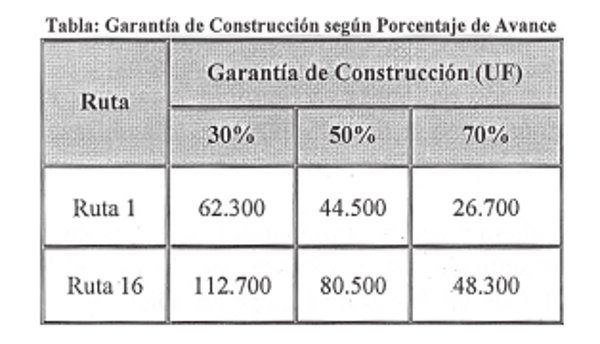 Una vez que haya sido acreditada la ejecución del 30%, 50% o 70% de la obra para cada ruta del proyecto, mediante la correspondiente Declaración de Avance prevista en 1.9.2.6, la Garantía de Construcción podrá ser reemplazada por diez (10) boletas de garantía bancaria, de igual monto, o bien, por una póliza de seguro de garantía de ejecución inmediata para concesiones de obras públicas según lo dispuesto en 1.8.1.3, debiéndose cumplir con las demás condiciones de acuerdo a lo exigido en el primer párrafo de 1.8.1.1, todos artículos de las Bases de Licitación. El plazo de vigencia de la Garantía de Construcción será la diferencia entre el plazo máximo de construcción y el tiempo transcurrido hasta la correspondiente Declaración de Avance, más 6 meses. Los montos de Garantía de Construcción a entregar por el Concesionario en reemplazo de las garantías vigentes, una vez que se acrediten los porcentajes de avance de la ejecución de las obras, se indican en la Tabla siguiente: