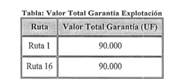 La Garantía de Explotación de cada ruta deberá estar constituida por diez (10) boletas de garantía bancaria, de igual monto, o bien, por una póliza de seguro de garantía de ejecución inmediata para concesiones de obras públicas, de acuerdo a lo dispuesto en el artículo 1.8.1.3 de las Bases de Licitación, pagaderas a la vista, emitidas en Santiago de Chile, por un Banco o Compañía de Seguros de la plaza, según corresponda, a nombre del Director General de Obras Públicas. La glosa y/o materia de dichos documentos será la siguiente: "Para garantizar el cumplimiento de las obligaciones durante la Etapa de Explotación para la Concesión de la Obra Pública Fiscal denominada Alternativas de Acceso a Iquique". La Garantía de Explotación deberá estar vigente durante todo el período de Concesión. El valor total de la Garantía de Explotación para cada tramo del Proyecto se indica en la Tabla siguiente:
