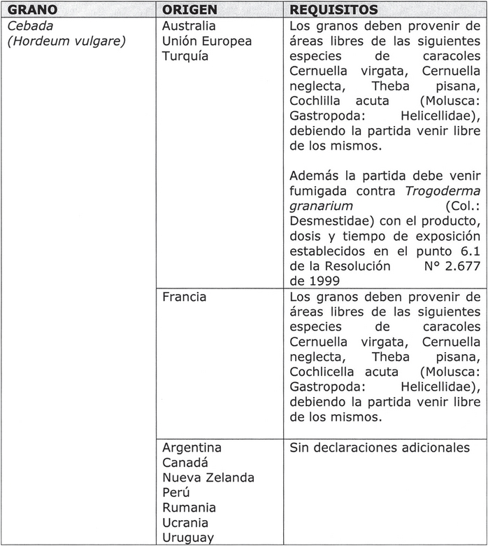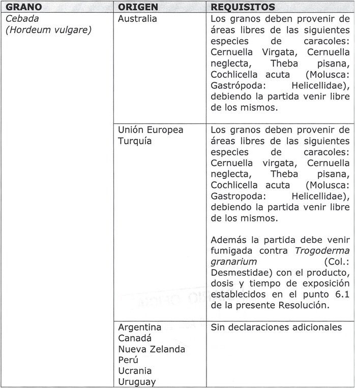 1. Agréganse al resuelvo número 3, las especies de granos para consumo, orígenes y requisitos que se listan a continuación, en el orden que alfabéticamente corresponda a cada grano, con su respectivo origen y requisito: