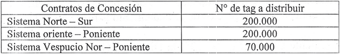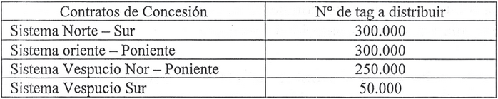 1. Las Bases de Licitación de los contratos de concesión urbanos que integran el denominado Sistema Interoperable, obligan a la distribución de un total de 900.000 dispositivos electrónicos (tag o televía) gratuitos, según el siguiente detalle: