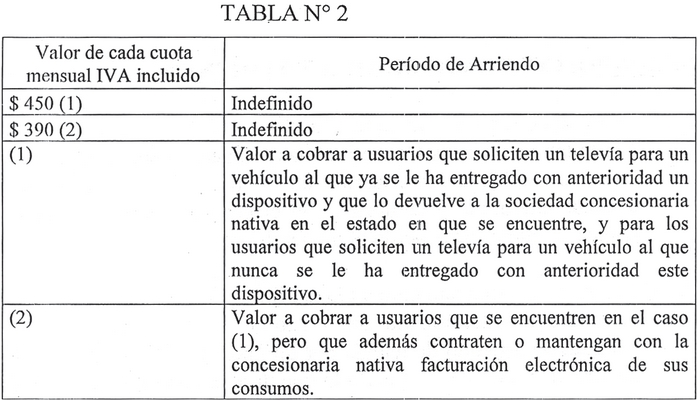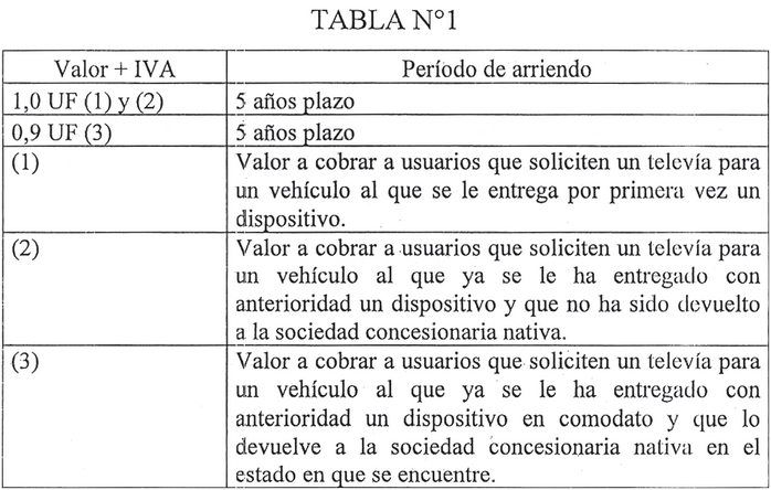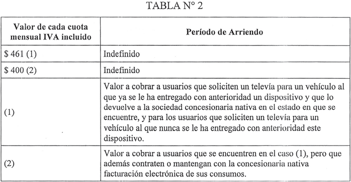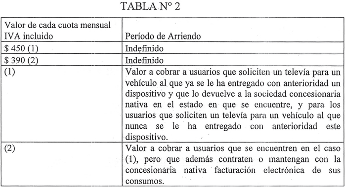 3.3 Todas las sociedades concesionarias ofrecerán la modalidad de arriendo de televía contemplada en la sección 2.1 de la cláusula anterior y podrán cobrar de acuerdo a lo establecido en Tabla Nº2: