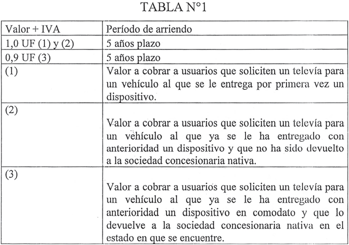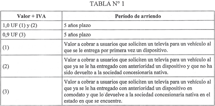 3.2 Las Sociedades Concesionarias Urbanas que ofrezcan la modalidad de arriendo de televía contemplada en la sección 2.2 de la cláusula anterior podrán cobrar de acuerdo a lo establecido en Tabla Nº 1: