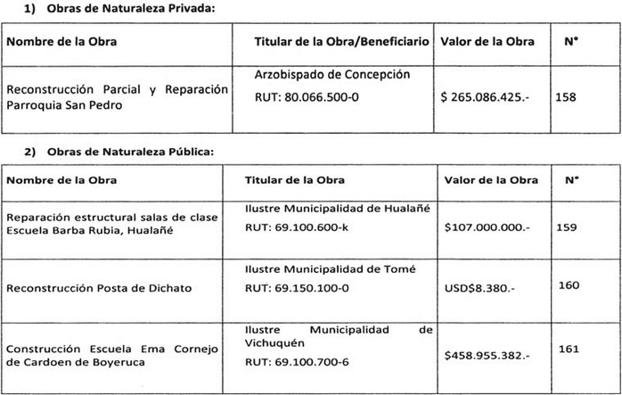 APRUEBA LISTADO DE OBRAS ESPECÍFICAS A QUE SE REFIERE EL ARTÍCULO 8º DE LA LEY Nº 20.444, QUE CREA EL FONDO NACIONAL DE LA RECONSTRUCCIÓN Y ESTABLECE MECANISMOS DE INCENTIVO TRIBUTARIO A LAS DONACIONES EFECTUADAS EN CASO DE CATÁSTROFE