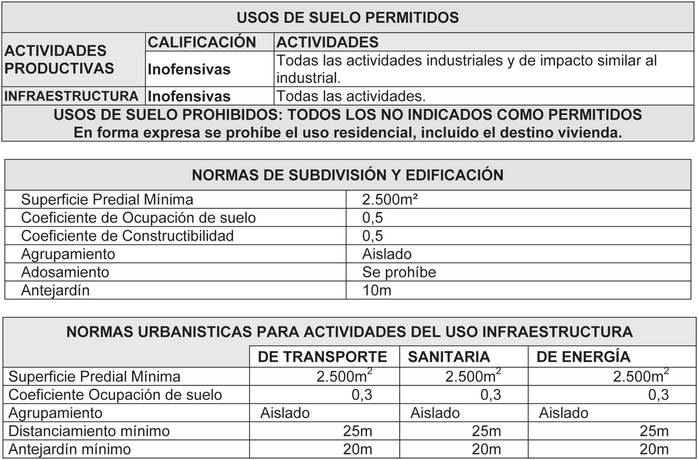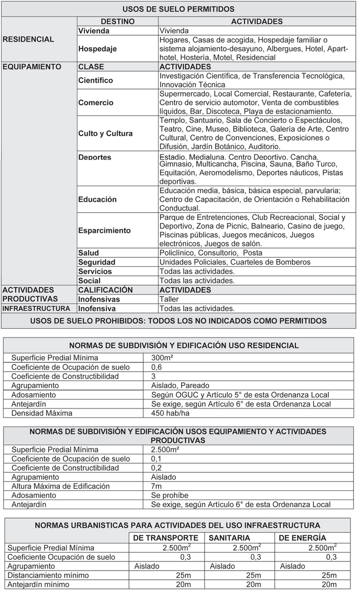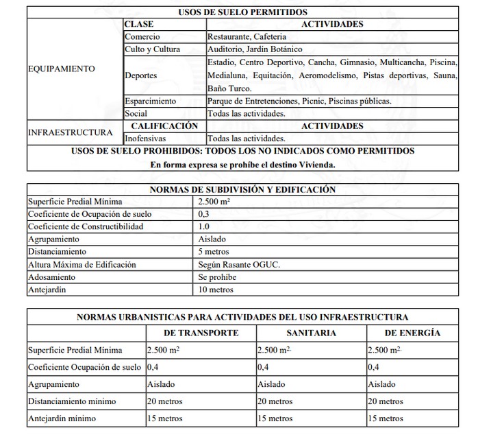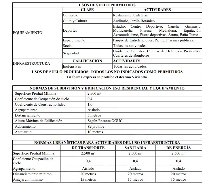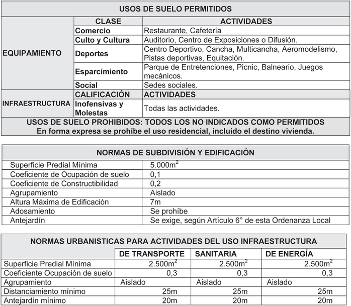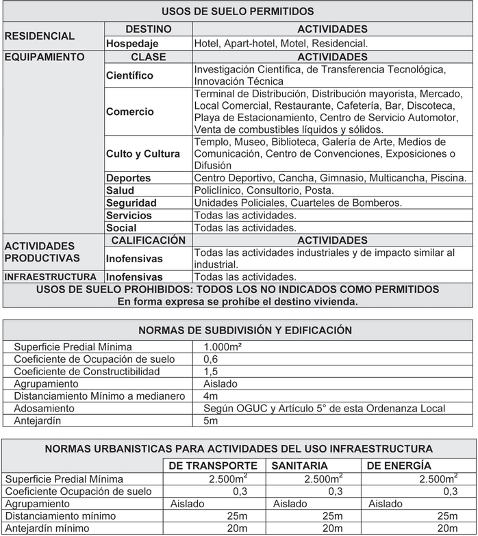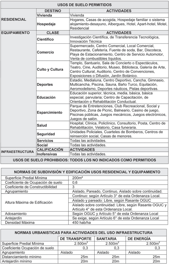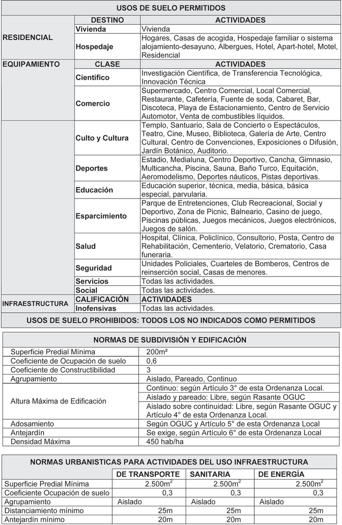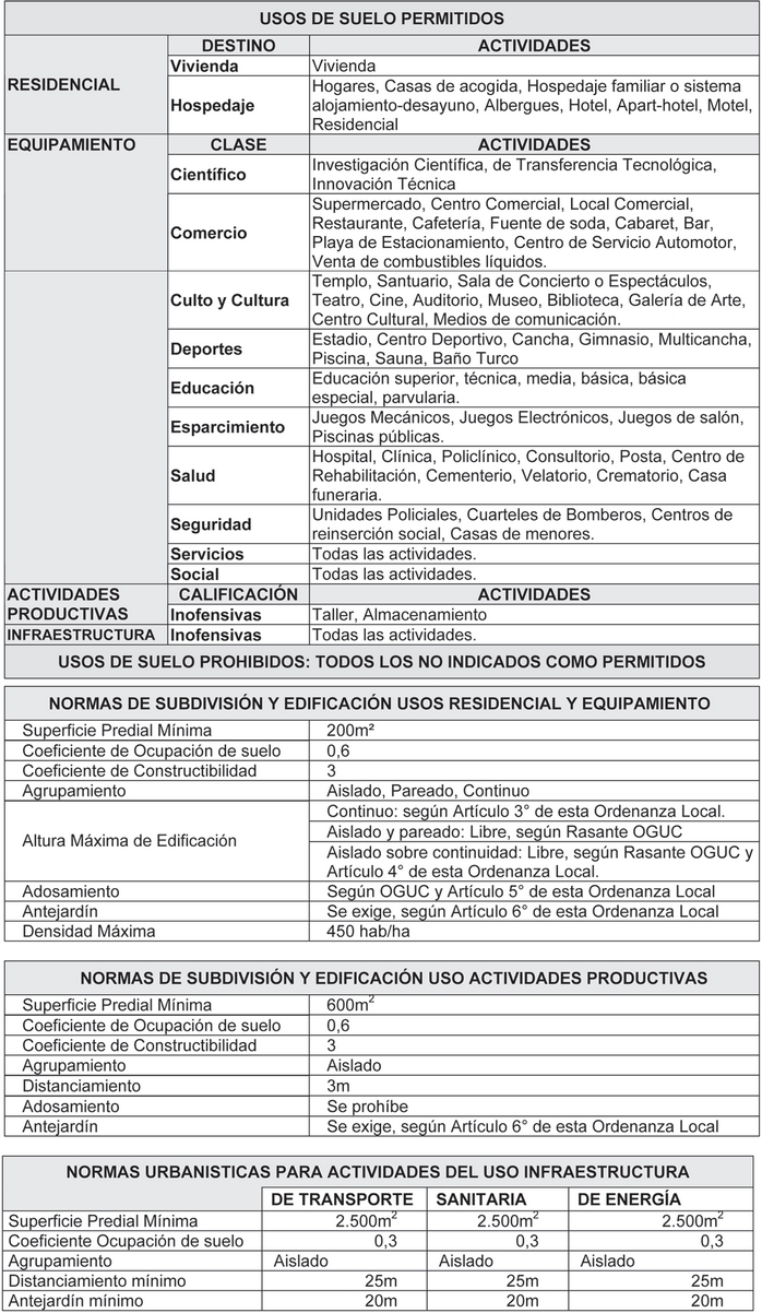 Para las zonas indicadas en el Artículo 21º, se fijan las normas de uso de suelo y condiciones de subdivisión y edificación que se indican a continuación: