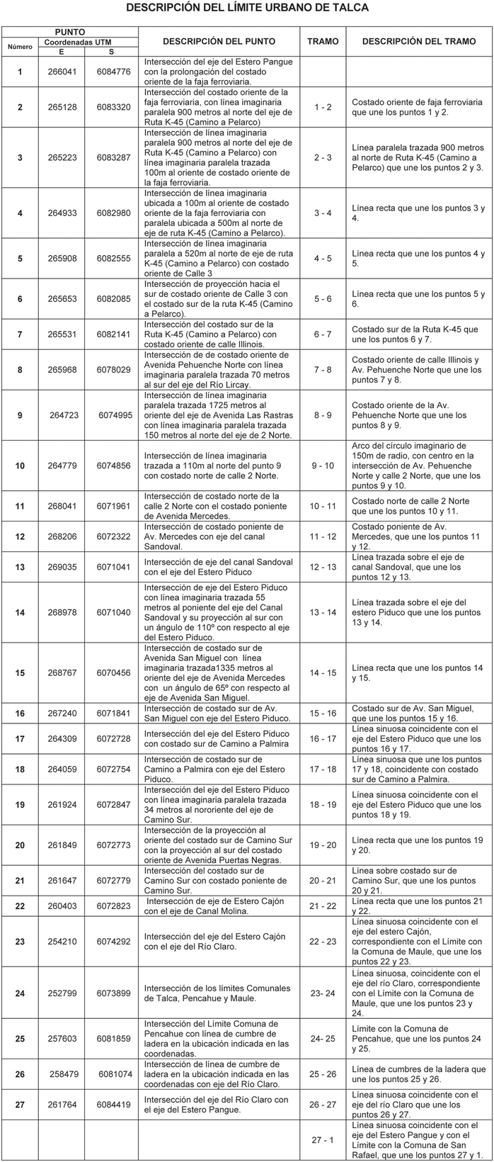 El Límite Urbano del PRCT se encuentra definido por una línea poligonal cerrada, identificada por los puntos 1, 2, 3, 4, 5, 6, 7, 8, 9, 10, 11, 12, 13, 14, 15, 16, 17, 18, 19, 20, 21, 22, 23, 24, 25, 26, 27 y 1. Lo anterior, de acuerdo a la descripción de puntos y tramos contenida en la tabla siguiente y su graficación en el Plano.