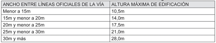 La altura máxima de la edificación continua se determinará conforme a la siguiente tabla:
