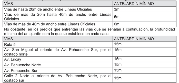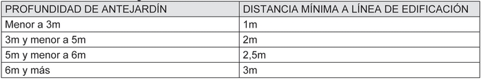 Cuando en una zona se exija antejardín, la profundidad mínima de éste se determinará según el ancho de la vía en la que se ubique la construcción, de acuerdo a la siguiente tabla:
