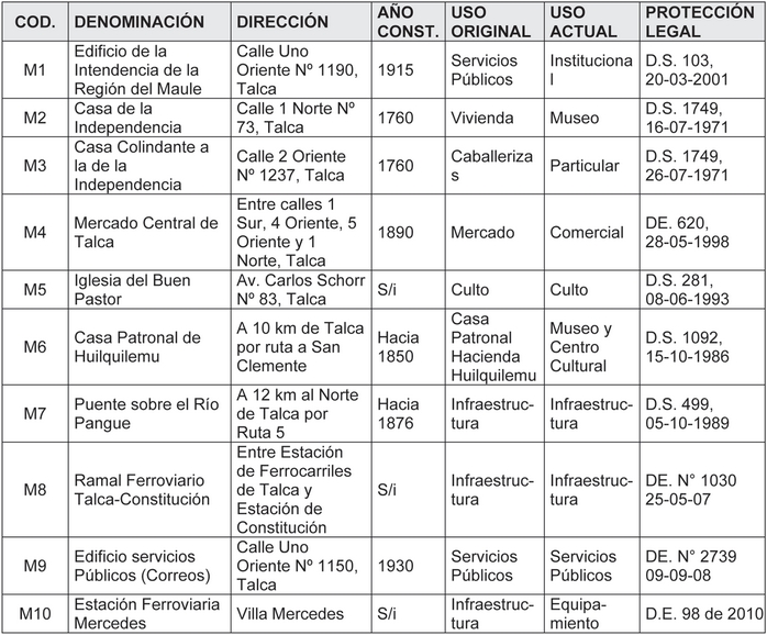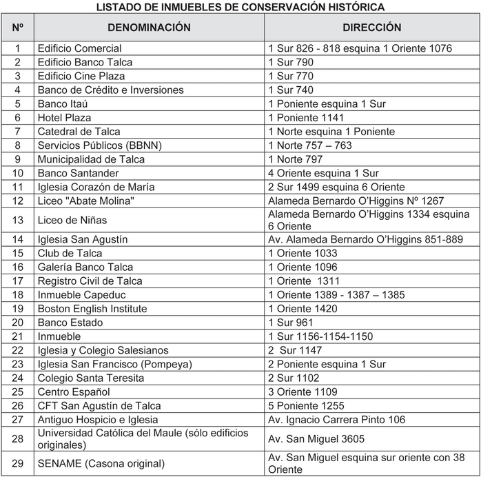 El PRCT reconoce y grafica en el Plano, los Recursos de Valor Patrimonial Cultural de la Comuna de Talca y que comprenden los Monumentos Nacionales y los Inmuebles y Zonas de Conservación Histórica que se declaran.