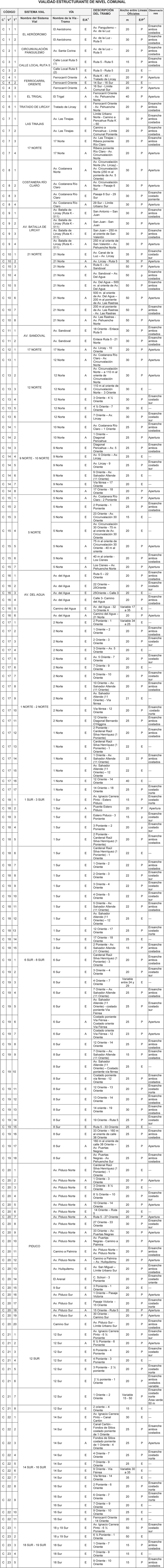 La vialidad estructurante de nivel intercomunal del Plan Regulador de Talca está constituida por las vías consignadas en el presente artículo, con sus respectivos nombres, indicación de tramos y ancho entre líneas oficiales, las que se declaran de utilidad pública.