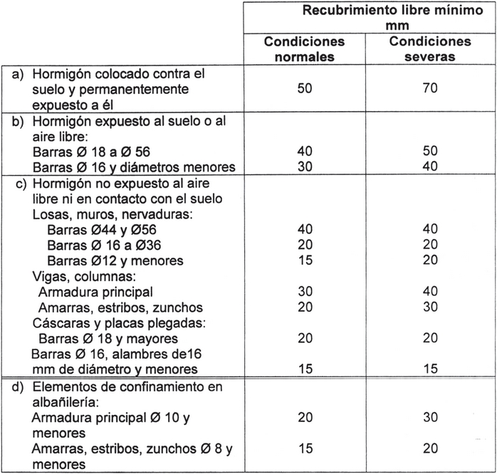 Se debe proporcionar el siguiente recubrimiento libre mínimo de hormigón a la armadura, siempre que no sea inferior al exigido por 7.7.6 y 7.7.8: