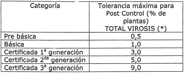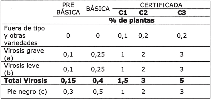 12.3. El resultado de las pruebas de post cosecha determinará en última instancia, la clasificación de la producción de un semillero en la categoría o generación que corresponda, según las siguientes tolerancias máximas.