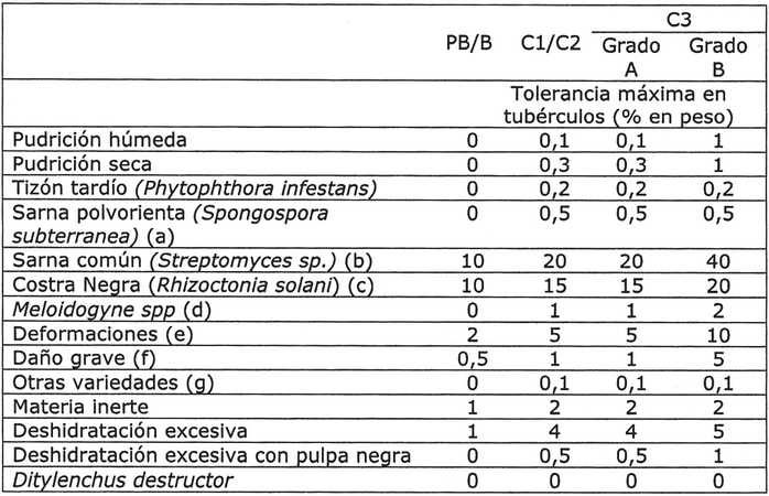 11.6. Durante el acondicionamiento deberán eliminarse los tubérculos fuera de calibre, de otras variedades, deformes, dañados, que presenten síntomas de pudrición seca, pudrición húmeda, atacados por nemátodos (Meloidogyne sp.), tizón tardío (Phytophthora infestans), sarna polvorienta (Spongospora subterranea), afectados por heladas, aquellos con ataque intenso de sarna común (Streptomyces scabies) y ataque intenso de costra negra (Rhizoctonia solani), de manera que no sean excedidas las tolerancias indicadas en la siguiente tabla.