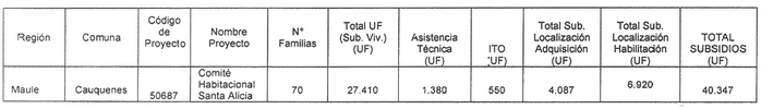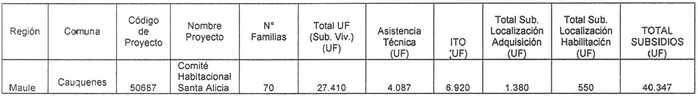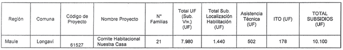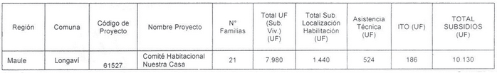 a) Reemplázase en el Resuelvo 1, la fila correspondiente al proyecto código "Comité Habitacional Nuestra Casa", de la comuna de Longaví, según indica: