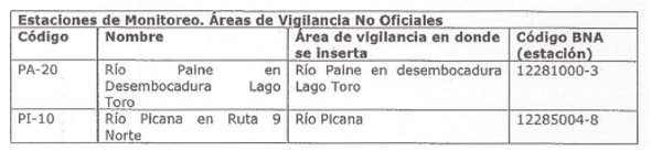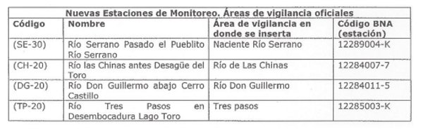 Por otro lado, en el presente Programa de Vigilancia se definen cuatro nuevas estaciones de monitoreo que se insertan dentro de áreas de vigilancia oficiales, con el objeto de recopilar información para decisiones futuras, en cursos de agua que forman parte de la red hídrica de la cuenca y que son relevantes por su caudal y por los niveles de calidad de sus aguas, actuando muchas veces como reguladores de las subcuencas orientales, además, son considerados importantes por reflejar el impacto de la actividad pecuaria, hotelera y turística del sector.