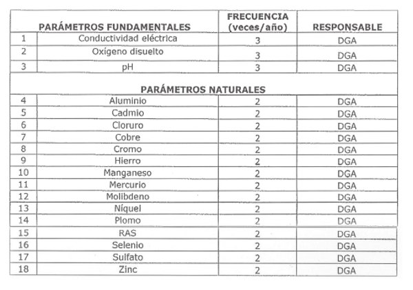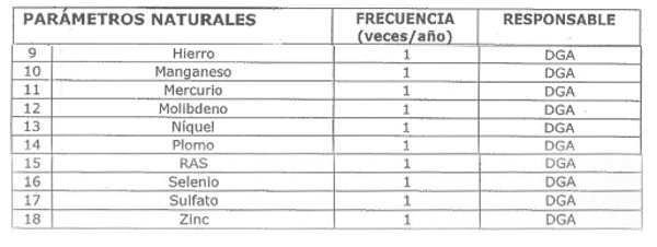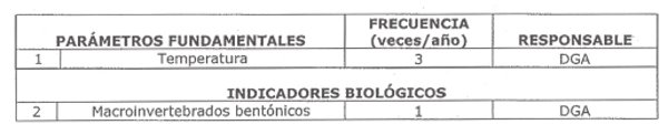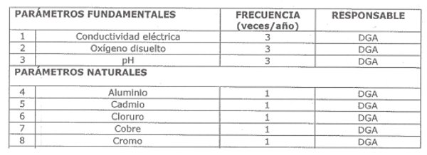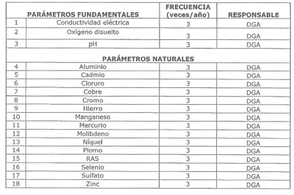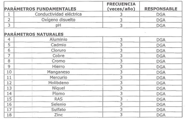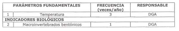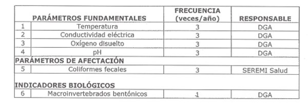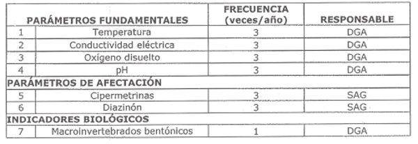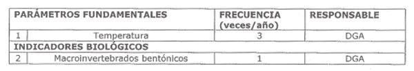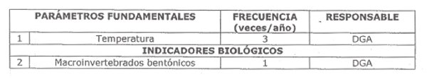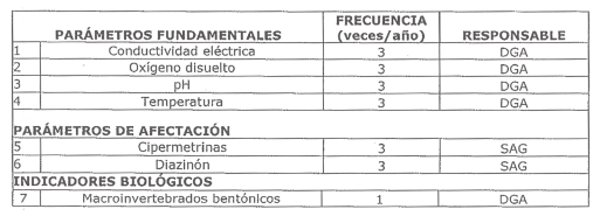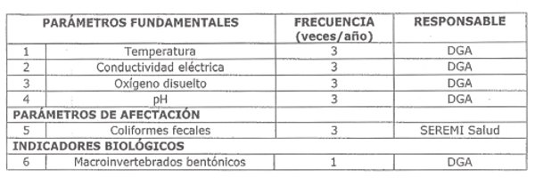 La siguiente tabla señala los parámetros que serán vigilados en esta estación, indicando la frecuencia de monitoreo y su responsable: