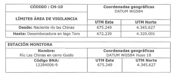 Actualmente existe una estación pluviométrica DGA. Sin embargo, se requiere caracterizar la calidad físico-química del agua en la zona de desembocadura del río Las Chinas en Lago Toro e igualmente la influencias del Río Don Guillermo en el sistema fluvial. Para ello se incluirá un punto de monitoreo que levante información del área de vigilancia "Río de Las Chinas" (CH-10), considerando que en esta área se desarrolla actividad ganadera extensiva, en donde se producen acontecimientos tales como el baño ovino, marca, dosificación, etc.