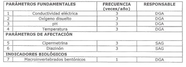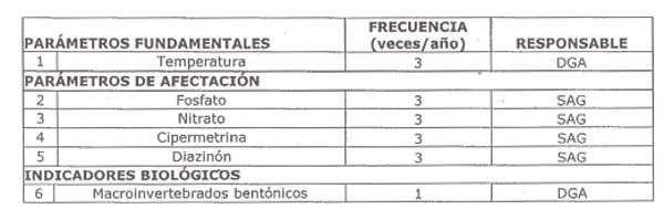 En cuanto a las Redes no oficiales (Redes de Observación) o aquellas que permitirán evaluar tanto la condición natural, la intervención antrópica y/o de investigación dentro de la cuenca, se consideró la incorporación de cuatro parámetros de responsabilidad del SAG (fosfato, nitrato, cipermetrina y diazinón), la frecuencia de monitoreo de dichos parámetros corresponde a los meses de febrero, abril y octubre, en virtud de que dichos parámetros apuntan al control de las actividades silvoagropecuarias en la zona.