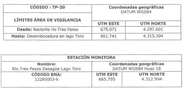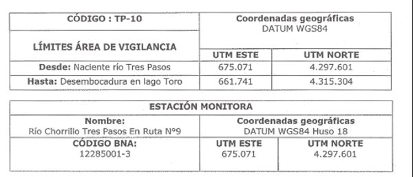 Se emplaza en el área de vigilancia "Río Tres Pasos (TP-10)", específicamente en la desembocadura del Río Tres Pasos en Lago Toro, donde existe actualmente una estación de monitoreo fluviométrica DGA. Es un área de ganadería extensiva, en donde se desarrollan actividades tales como el baño ovino, marca, dosificación, etc.