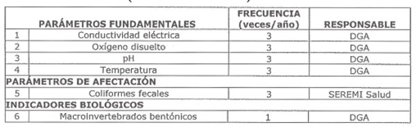 Para el caso del monitoreo del parámetro coliformes fecales, la frecuencia de muestreo será coincidente con la establecida para la Red oficial de control antes mencionada (febrero - junio y octubre). Dicho monitoreo será de responsabilidad de la Seremi de Salud y se enmarca en el Convenio de cooperación suscrito entre la Conama, la Dirección General de Aguas y la Seremi de Salud de Magallanes y la Antártica Chilena, aprobado mediante la Res. Ex. Nº 4.180 del 29 de septiembre de 2010 del Ministerio de Salud y la Res. Ex. Nº 442 de Conama del 30 de septiembre de 2010.