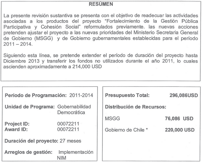 El Proyecto Nº 00072211 "Fortalecimiento de la Gestión Pública Participativa y Cohesión Social", firmado entre el Gobierno de Chile y el PNUD en octubre de 2009, en el contexto del Programa País 2007-2010, se proponía fortalecer el funcionamiento de mecanismos de participación ciudadana en la gestión pública, difundiendo nuevas metodologías de trabajo validadas y experiencias exitosas fortaleciendo la labor en esta área de acuerdo a las prioridades gubernamentales definidas para el período 2006 - 2009.