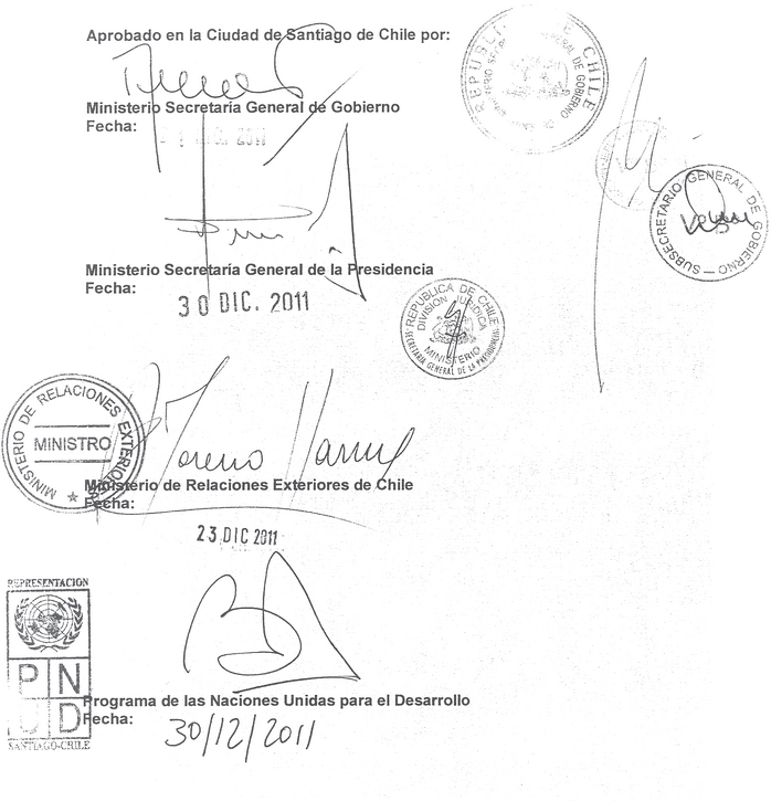 Que con fechas 23 y 30 de diciembre de 2011 se suscribió, en Santiago, entre el Gobierno de la República de Chile y el Programa de las Naciones Unidas para el Desarrollo, la Revisión Sustantiva sobre el Proyecto: "Fortalecimiento de la Gestión Pública Participativa y Cohesión Social", publicado en el Diario Oficial de 14 de abril de 2010.