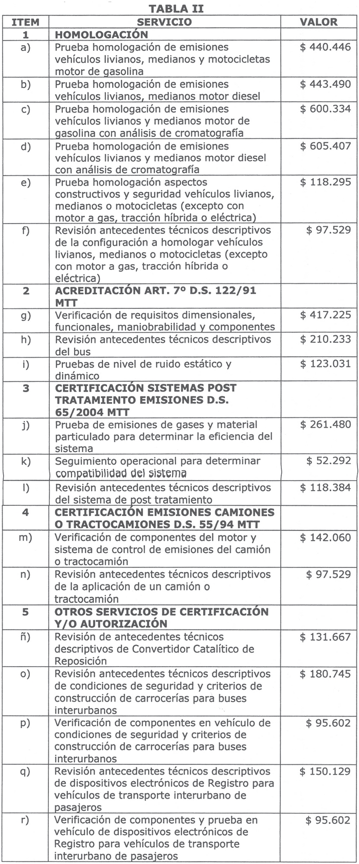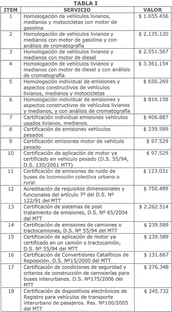 Núm. 174.- Santiago, 11 de octubre de 2011.- Visto: Lo dispuesto por el artículo 32 Nº 6 de la Constitución Política de la República; el DFL Nº 1 de 2007 del Ministerio de Transportes y Telecomunicaciones y Ministerio de Justicia, que fija el texto refundido, coordinado y sistematizado de la Ley Nº 18.290, de Tránsito; el decreto supremo Nº 33, de 2004, el decreto supremo Nº 15 de 2000, el decreto supremo Nº 175, de 2006, el decreto supremo 55, de 1998, la resolución Nº 100 de 2005, todos del Ministerio de Transportes y Telecomunicaciones; el informe "Evaluación de Costos y Nuevas Tarifas por Servicios del Centro de Control y Certificación Vehicular, Mayo 2011", elaborado por el Centro de Control y Certificación Vehicular; la resolución Nº 1.600, de 2008 de la Contraloría General de la República, y demás normativa aplicable en la materia.