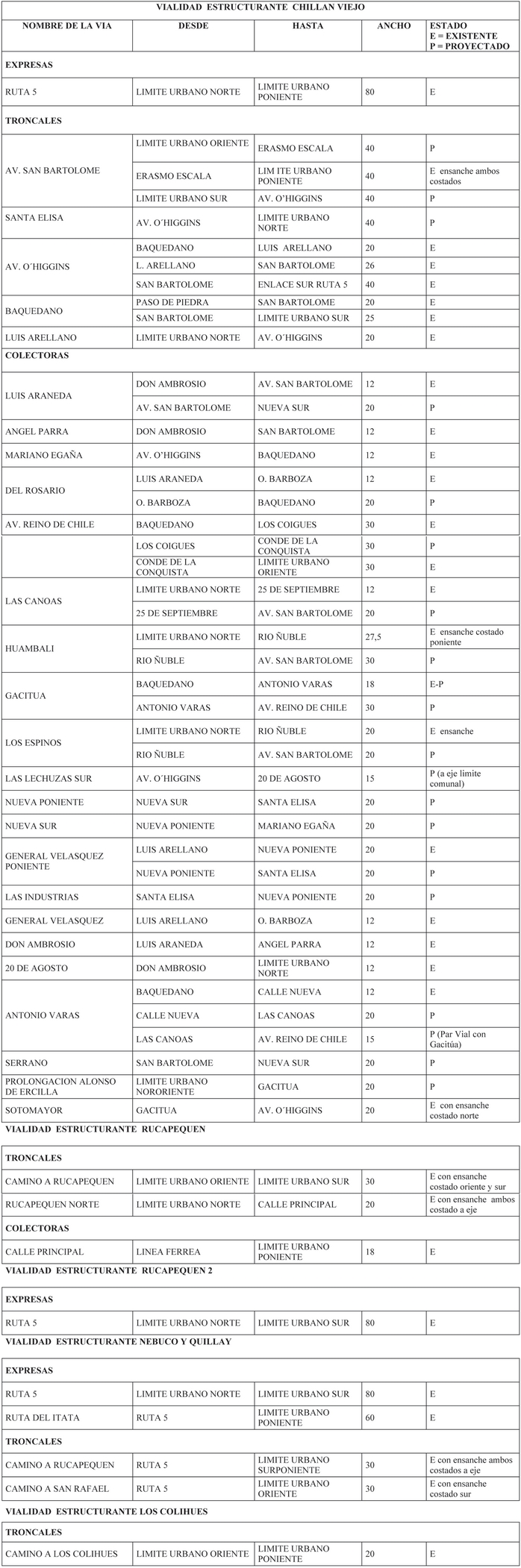 El numeral 1° del Decreto 4219. M. de Chillan Viejo, publicada el 12.01.2018, modifica la presente norma en el sentido de aprobar, en el cuadro de Vialidad Estructurante, en el sentido de eliminar la vía proyectada denominada calle Nueva Sur, en el tramo comprendido entre calle Serrano y Mariano Egaña. En el cuadro de Vialidad Estructurante se debe reemplazar en fila de Nombre de vía: Nueva Sur, columna que señala "Mariano Egaña" se reemplaza por "Serrano", así mismo compleméntese el actual plano: "PRCHV'', con el nuevo plano: "PRCHV-1", que contiene la gráfica de la vía Nueva Sur.