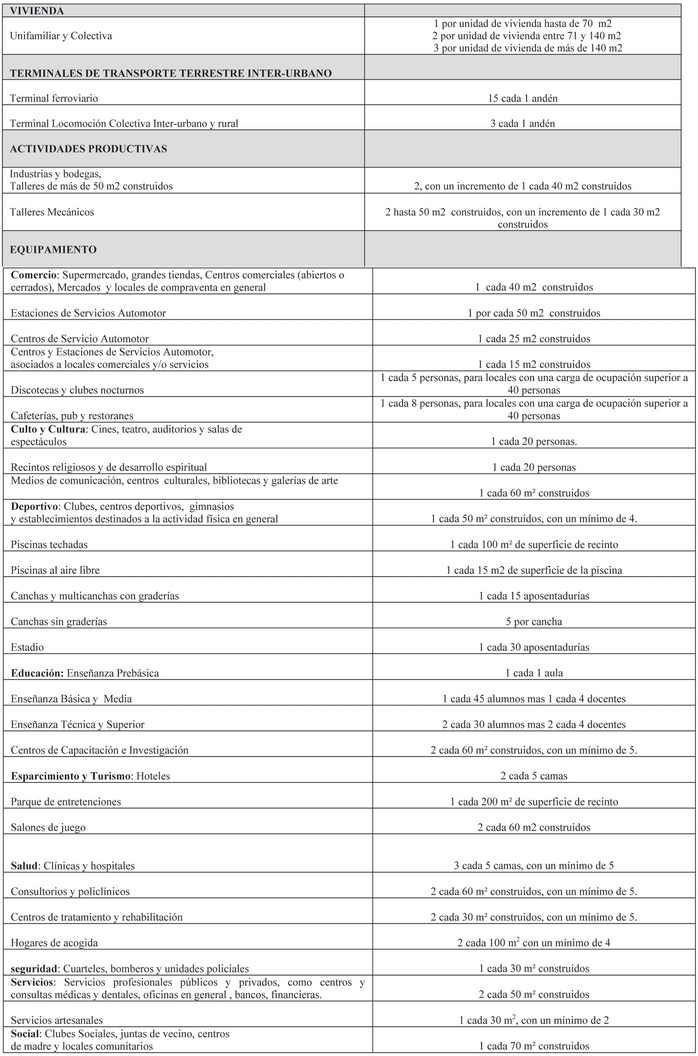 . Artículo 5.- Estacionamientos: Al interior del límite urbano se establecen los siguientes estándares de estacionamiento: