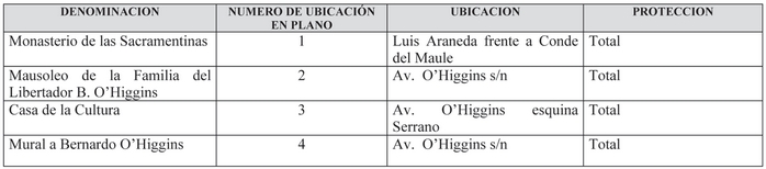 Artículo 13.- Protección para Inmuebles de Conservación Histórica. Los Inmuebles de Conservación Histórica que se identifican en el área urbana regulada por el presente Plan Regulador Comunal y su protección en función del grado de intervención, son los siguientes: