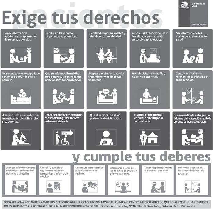 5. Autorízase a los prestadores y, en general, a los medios de comunicación a reproducir la Carta de Derechos y Deberes de las personas en relación con la atención de salud, en folletos, revistas, circulares, videos y otros similares, siempre que se haga de manera íntegra e incluyendo la frase "Carta de Derechos y Deberes de los Pacientes (Ley Nº 20.584). Para mayor información ver www.minsal.cl.".