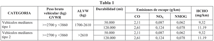 a) Los límites señalados en la Tabla 1 siguiente, serán aplicables a vehículos cuyo motor utilice gasolina, bioetanol, gas natural, o gas licuado de petróleo como combustible. Asimismo, aplicarán para aquellos denominados "flexible fuel" que define la Agencia de Protección Ambiental de los Estados Unidos de Norteamérica (USEPA), en el llamado "Code of Federal Regulation" título 40, parte 86-Control of air pollution from new Vehicle engines y que utilicen combustible autorizado.
