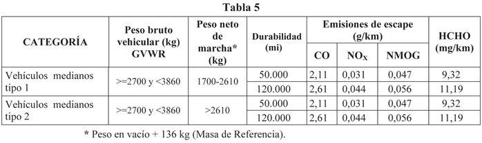 a) Los límites señalados en la Tabla 5, son aplicables a vehículos cuyos motores utilicen gasolina, bioetanol, gas natural, o gas licuado de petróleo como combustible. Asimismo, aplicarán para aquellos denominados "flexible fuel" que define la Agencia de Protección Ambiental de los Estados Unidos de Norteamérica (USEPA), en el llamado "Code of Federal Regulation" título 40, parte 86-Control of air pollution from new Vehicle engines y que utilicen combustible autorizado.