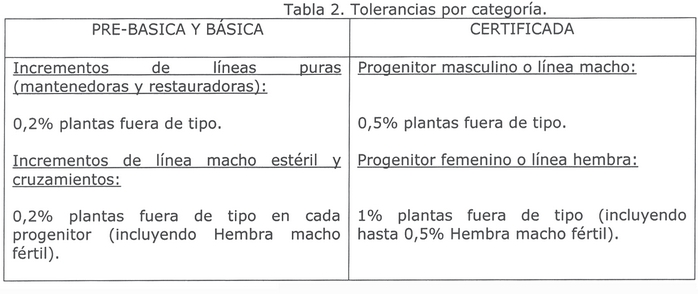 6.5. Cumplir con las tolerancias por categoría que se señalan en la Tabla 2, las que se aplicarán cuando el 5% de las plantas del progenitor femenino o de la línea hembra presenten a lo menos una circunferencia de flores tubulares con pistilos receptivos en el capítulo.