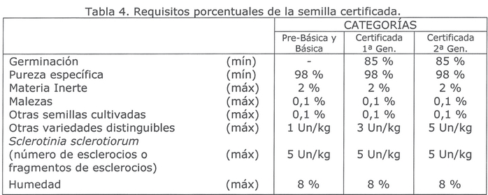 7.1. Los requisitos porcentuales que deben cumplir los lotes de semilla certificada de maravilla para las diferentes categorías son los indicados en la Tabla Nº4, definiéndose el tamaño de lote en la norma general: