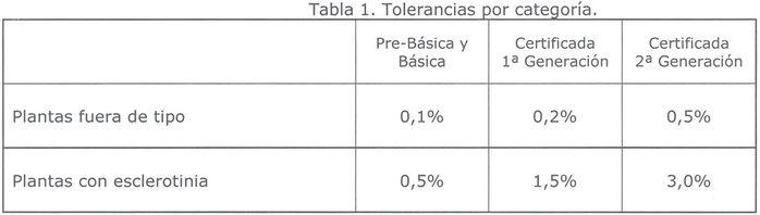 6.3. Cumplir con las tolerancias por categoría que se señalan en la Tabla 1. Se rechazará todo semillero que exceda dichas tolerancias.