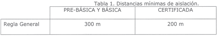 En el caso de semilleros de categoría Pre-básica y Básica, se podrá reducir a 200 m la distancia a otro semillero bajo certificación de la misma categoría, siempre que este último no sobrepase, en superficie, el doble del tamaño del semillero.