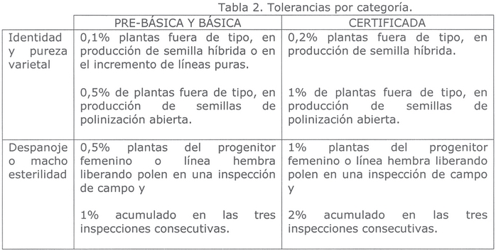 6.4. Cumplir con las tolerancias por categoría que se señalan en la Tabla 2, las que se aplicarán cuando el 5% de las plantas del progenitor femenino o de la línea hembra presente sedas (estigmas) visibles.
